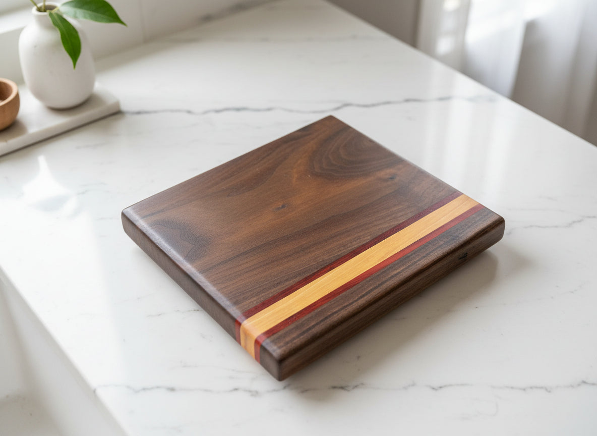 Compact, bold, and beautifully handcrafted — Artisan Board #24 showcases rich walnut paired with vibrant padauk and warm cherry accent stripes. The contrast of deep chocolate tones with bright red and soft amber makes this board a standout piece in any kitchen.